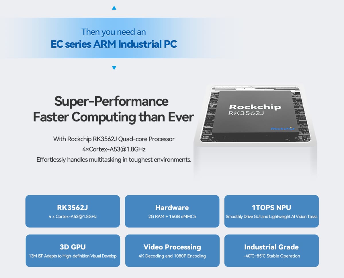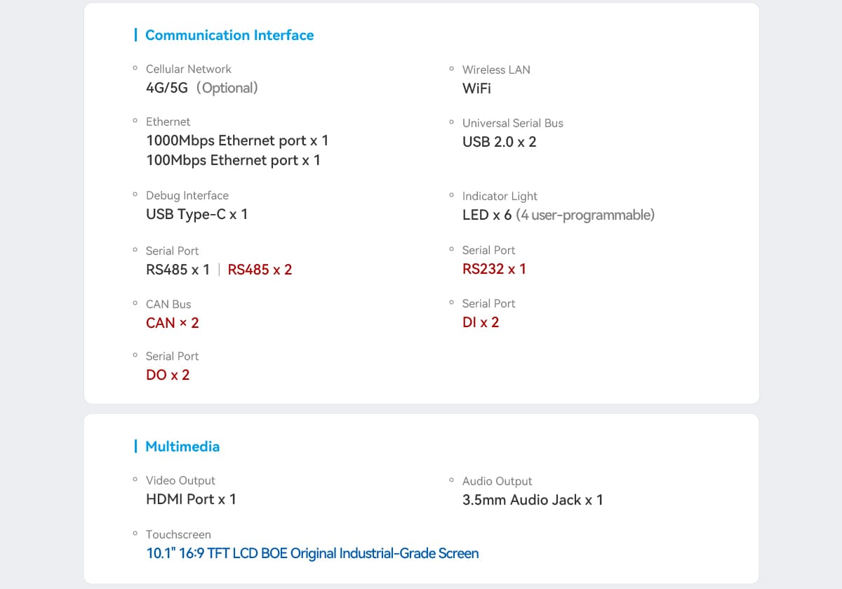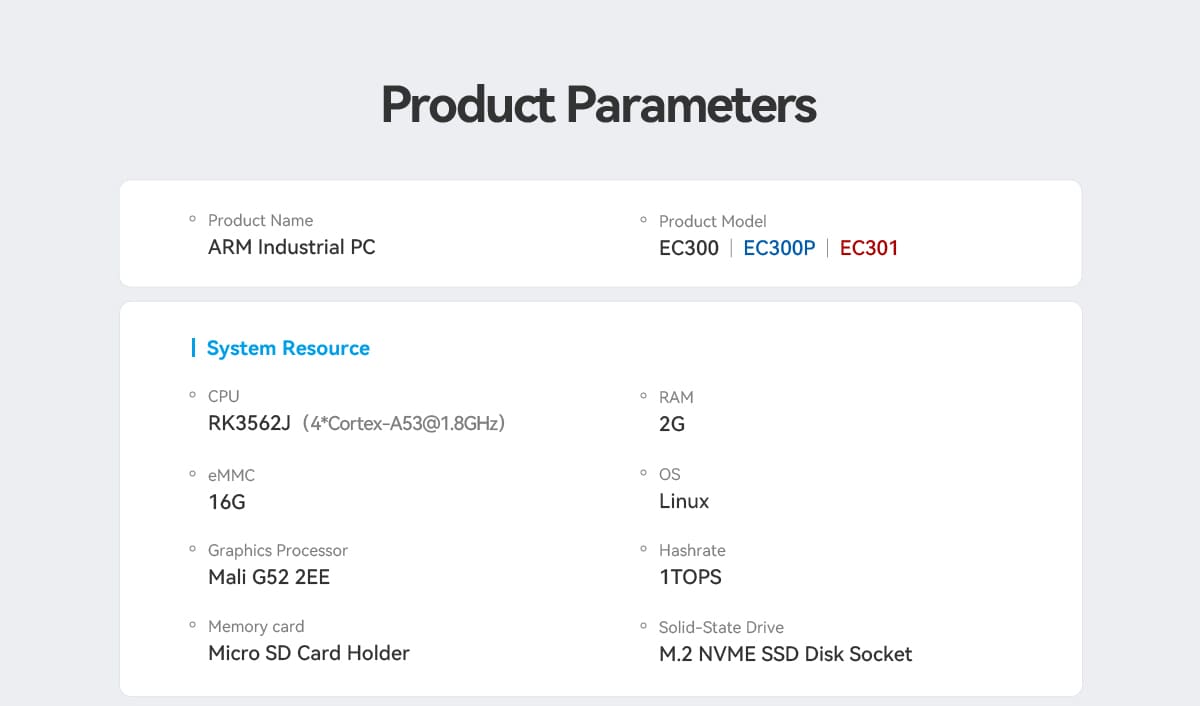 The EC300 / EC301 / EC300P Touchscreen Multi-Interface ARM Industrial Computer is a powerful embedded computing platform built for industrial control systems, IoT gateways, and automation solutions. Designed with a responsive touchscreen interface and a high-performance ARM processor, this device enables efficient control and monitoring in demanding industrial environments.Equipped with multiple communication interfaces, the EC300 series allows seamless integration with sensors, controllers, and industrial equipment. Its robust architecture supports open-source operating systems and flexible software development, making it ideal for developers and system integrators building advanced industrial solutions.The integrated touchscreen provides a user-friendly human-machine interface (HMI), allowing operators to easily monitor data, control systems, and interact with industrial processes. The EC300 series is suitable for applications such as smart manufacturing, automation control panels, remote monitoring systems, and IoT data gateways.Compact, reliable, and scalable, the EC300 industrial computer offers a dependable solution for modern industrial and embedded computing requirements.