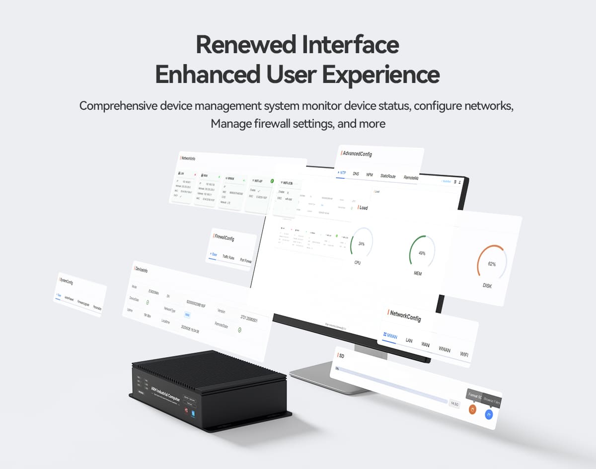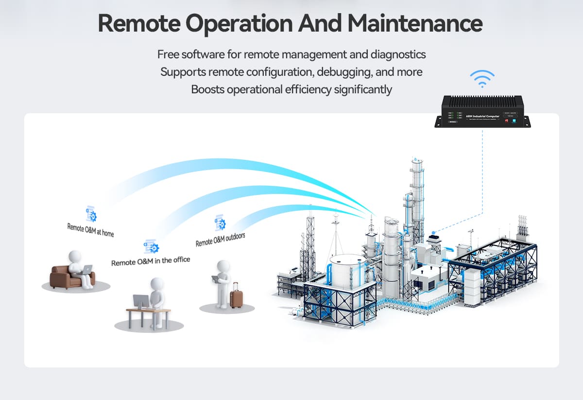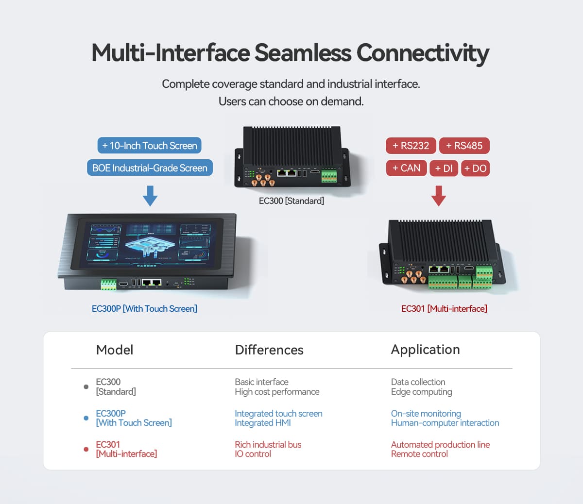 The EC300 / EC301 / EC300P Touchscreen Multi-Interface ARM Industrial Computer is a powerful embedded computing platform built for industrial control systems, IoT gateways, and automation solutions. Designed with a responsive touchscreen interface and a high-performance ARM processor, this device enables efficient control and monitoring in demanding industrial environments.Equipped with multiple communication interfaces, the EC300 series allows seamless integration with sensors, controllers, and industrial equipment. Its robust architecture supports open-source operating systems and flexible software development, making it ideal for developers and system integrators building advanced industrial solutions.The integrated touchscreen provides a user-friendly human-machine interface (HMI), allowing operators to easily monitor data, control systems, and interact with industrial processes. The EC300 series is suitable for applications such as smart manufacturing, automation control panels, remote monitoring systems, and IoT data gateways.Compact, reliable, and scalable, the EC300 industrial computer offers a dependable solution for modern industrial and embedded computing requirements.