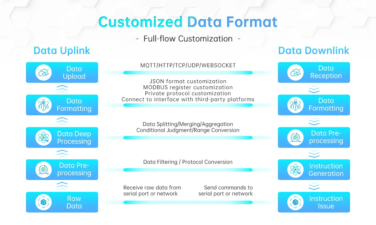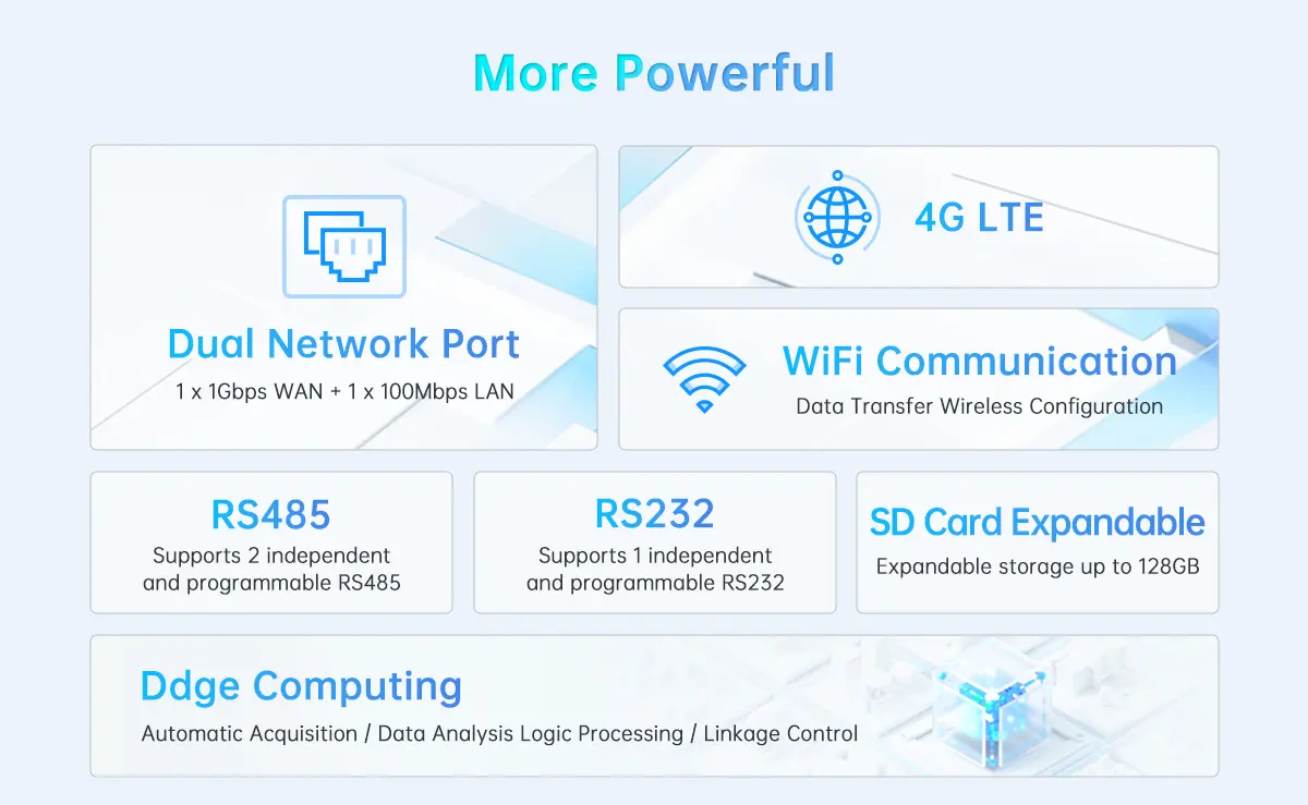 The gateway supports multiple industrial communication interfaces, enabling seamless integration with sensors, PLCs, controllers, and other industrial equipment. With edge computing capabilities, it can process and filter data locally before transmitting it to cloud platforms or enterprise systems, improving system efficiency and reducing network load.