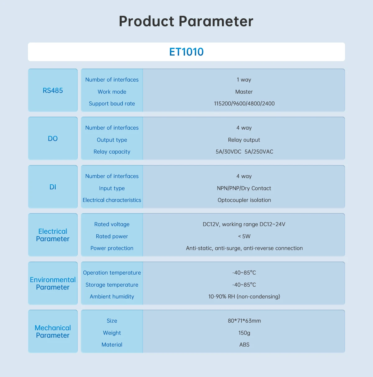 The ET1010 Switching I/O Expansion Module is a reliable industrial expansion module designed to enhance digital input and output capabilities for automation systems, controllers, and industrial gateways. It allows seamless integration of additional switching channels for monitoring and controlling industrial equipment.The module supports digital switching inputs and outputs, making it suitable for connecting devices such as switches, relays, sensors, actuators, and industrial control equipment. It enables efficient data acquisition and device control in automation systems and industrial IoT networks.With its compact and industrial-grade design, the ET1010 can be easily installed in control cabinets and integrated into existing automation infrastructure. It provides stable performance and dependable operation for applications such as smart manufacturing, industrial monitoring, energy systems, and remote automation control.The ET1010 module is an ideal solution for expanding digital I/O capabilities in modern industrial automation environments.