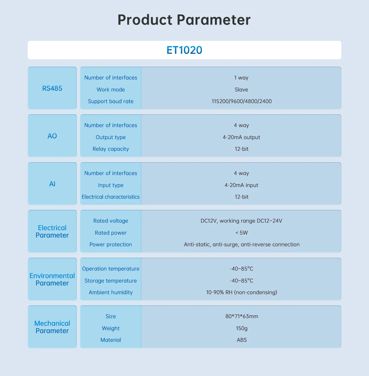 This module enables connection with various analog sensors and industrial equipment, allowing accurate monitoring of parameters such as temperature, pressure, voltage, and current signals. The ET1020 ensures stable and precise analog data transmission between field devices and control systems.